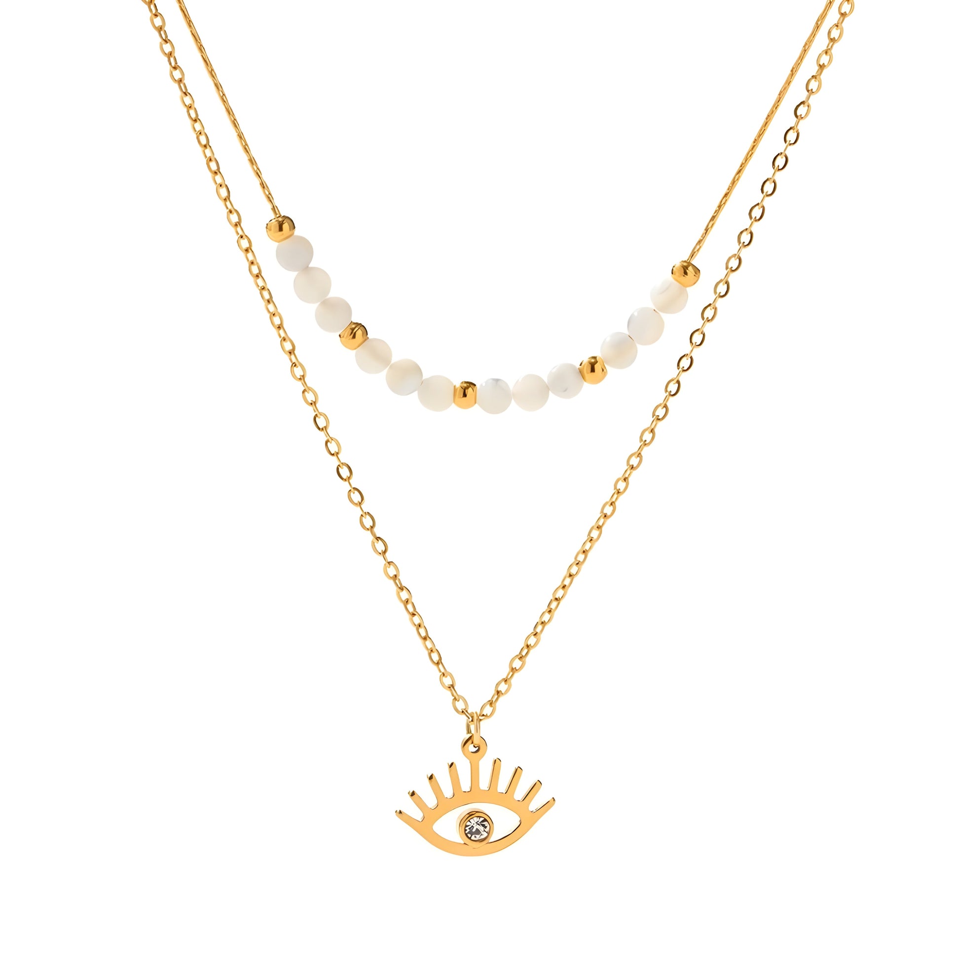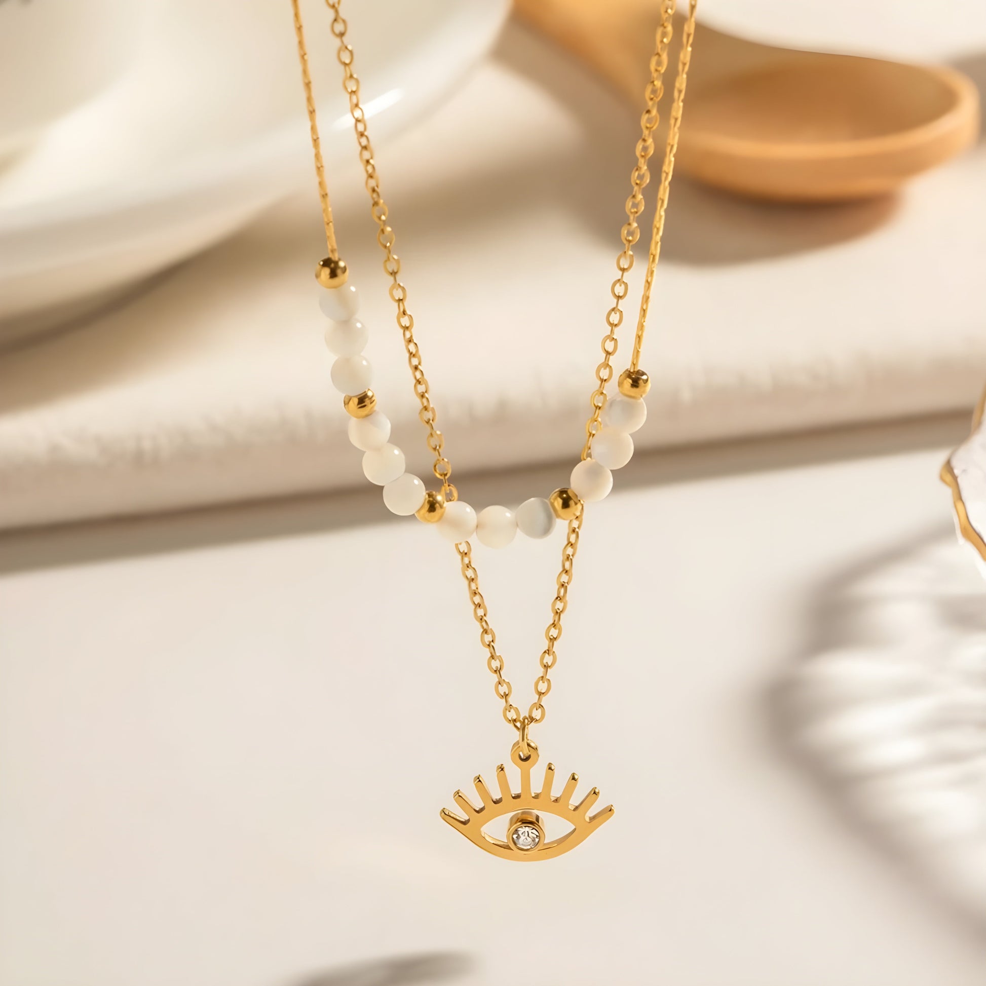 This delicate layered necklace features two beautifully designed chains that combine modern elegance with a hint of bohemian charm. The top chain is adorned with white beads interspersed with gold accents, creating a fresh and light look. Below, a gold pendant in the shape of an eye with a sparkling center stone adds an element of mystique and sophistication. The gold chain complements the beads and the eye design, offering a subtle yet luxurious appeal.