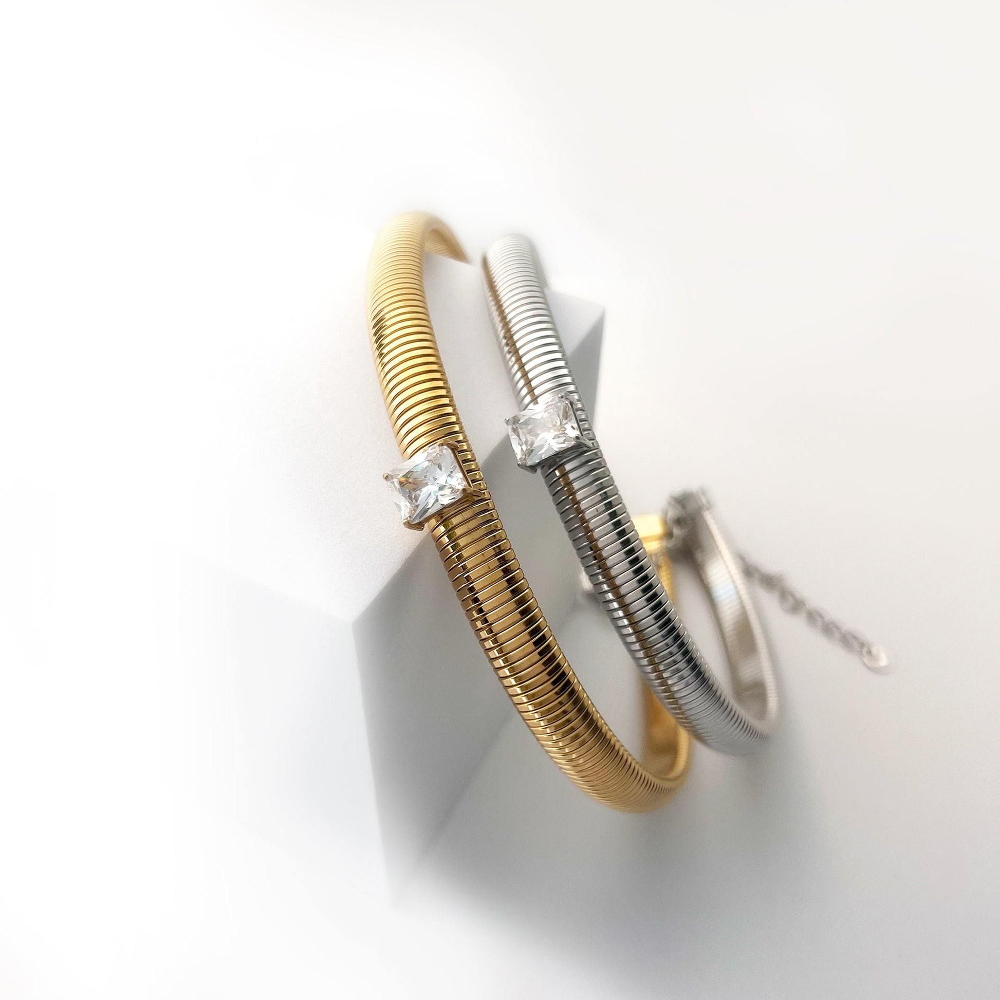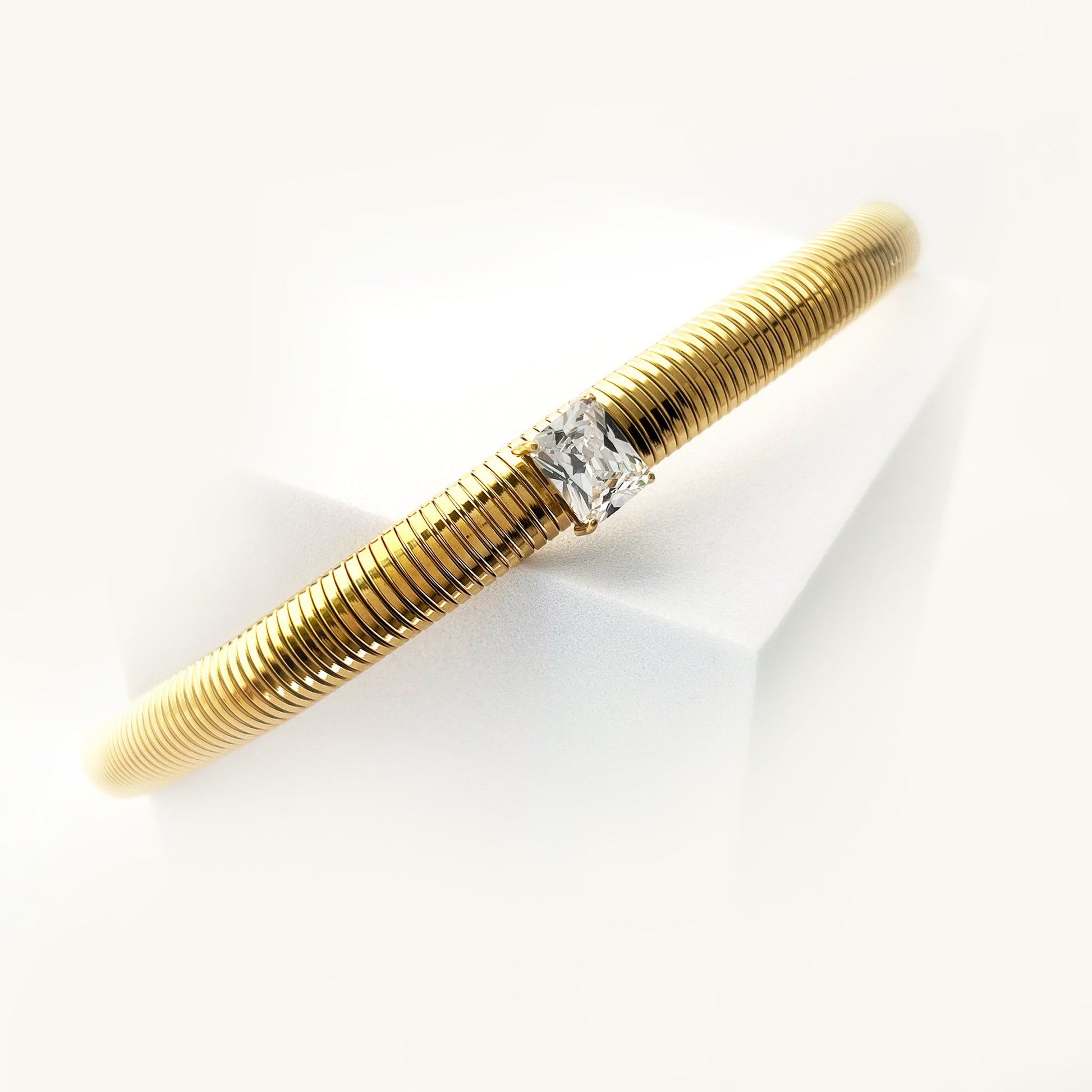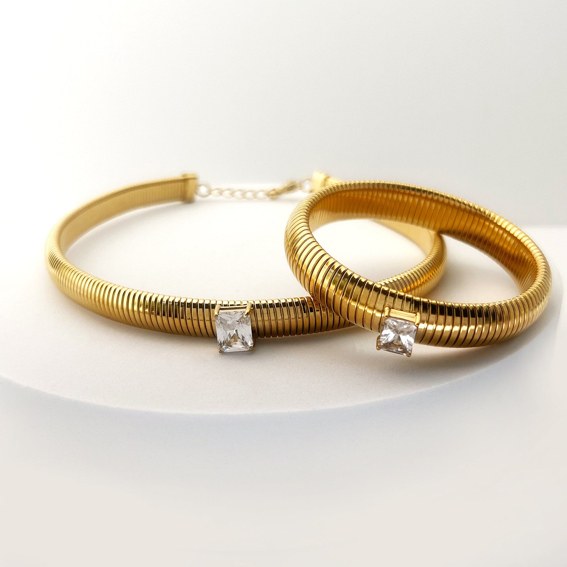 This Behi Milano choker features a luxurious and modern design, combining elegance with a bold statement. Made from glossy gold-toned metal, it has a wide, flexible band with sleek, uniform lines that gracefully wrap around the neck. At its center, a sparkling square-cut stone adds a touch of sophistication and brilliance.