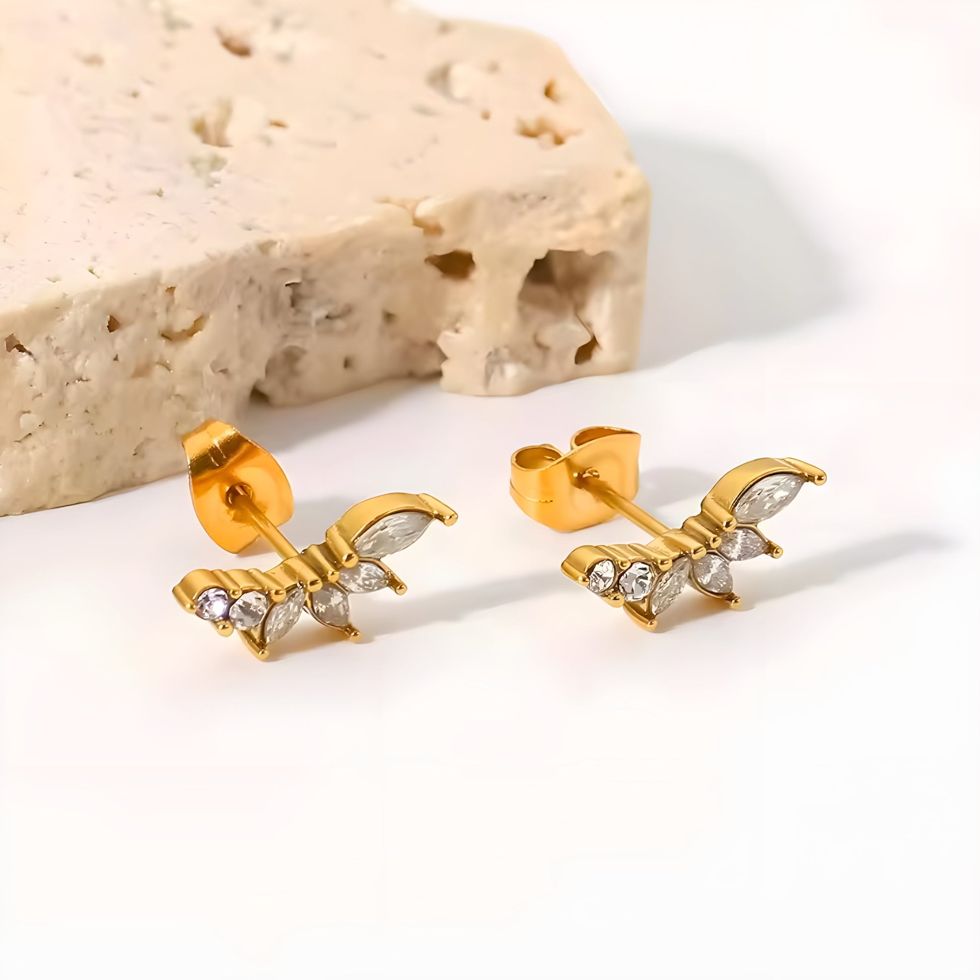 These earrings feature a delicate, floral-inspired design with a luxurious golden finish. The earrings are stud-style, with multiple marquise-cut stones arranged to resemble petals, enhanced by smaller round stones that add sparkle. The overall shape is graceful, offering a refined and elegant touch to any outfit. The combination of the gold setting and the shimmering stones gives the earrings a timeless, sophisticated appeal, perfect for formal occasions or when you want to add a touch of glamour to your look.