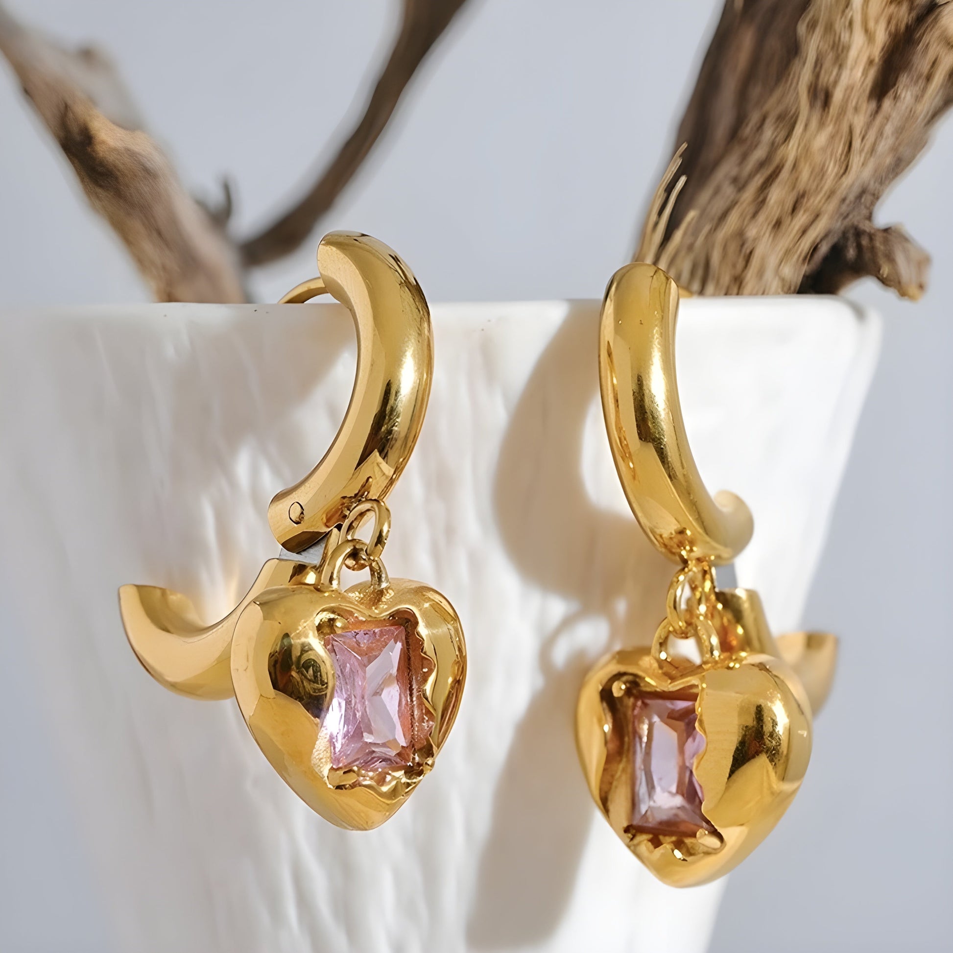 These golden heart earrings with pink gemstones are perfect for adding a touch of romantic glamour and a playful element to any outfit.