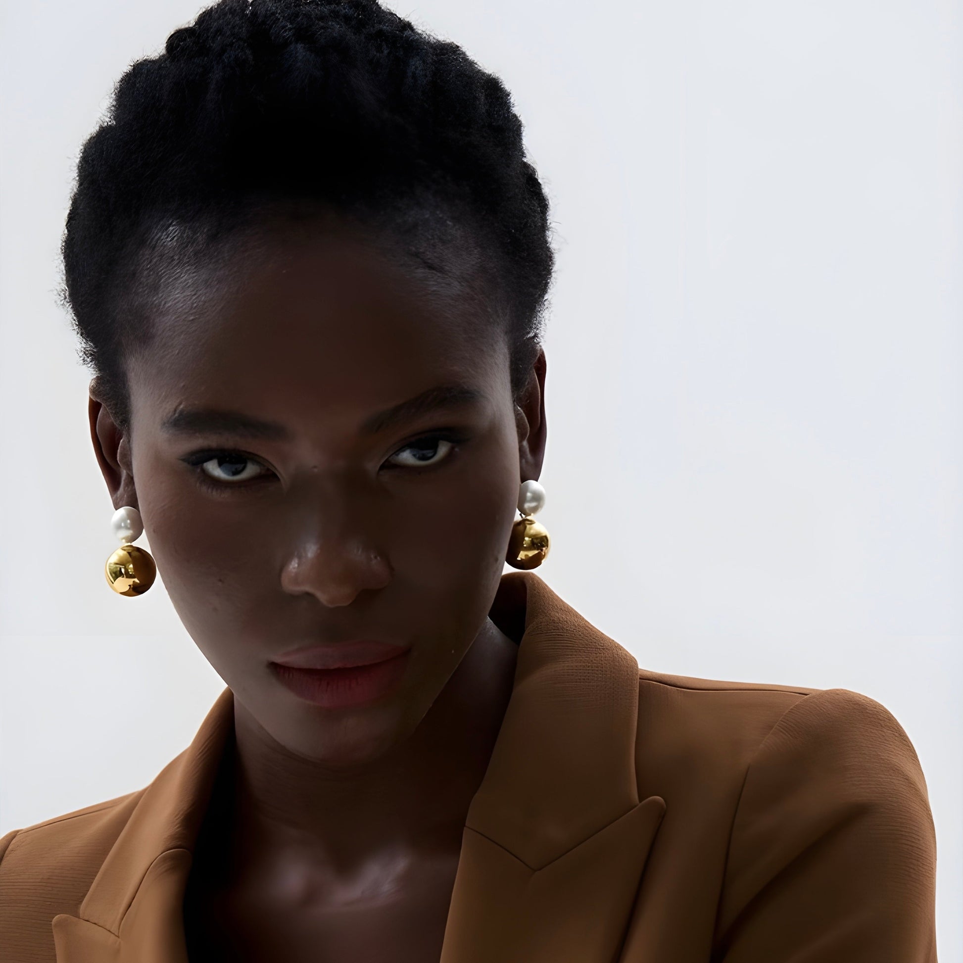 These earrings feature a striking and contemporary design, with two contrasting elements: a smooth, polished gold ball at the bottom and a sleek, lustrous pearl at the top. The combination of these materials creates a sophisticated yet bold statement, blending modern metallic elegance with the timeless charm of pearls.